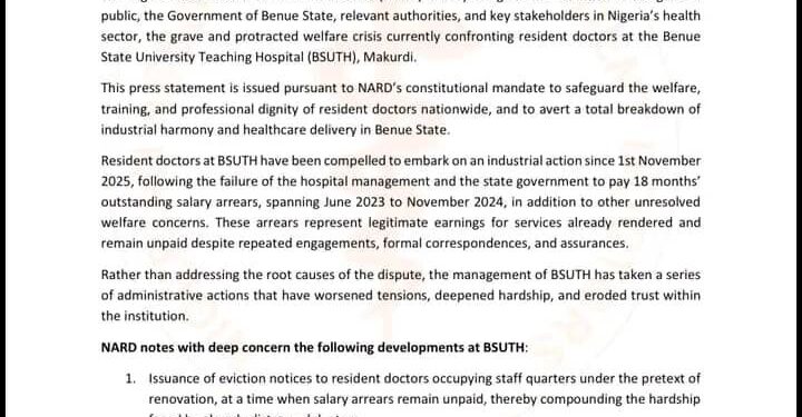 In a press statement issued on 24 January 2026, NARD disclosed that resident doctors at BSUTH have been on industrial action since 1st November 2025, following the failure of the hospital management and the Benue State Government to pay 18 months’ salary arrears, spanning June 2023 to November 2024.