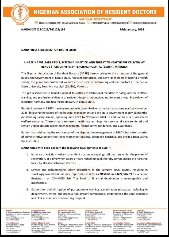 In a press statement issued on 24 January 2026, NARD disclosed that resident doctors at BSUTH have been on industrial action since 1st November 2025, following the failure of the hospital management and the Benue State Government to pay 18 months’ salary arrears, spanning June 2023 to November 2024.